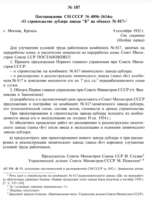 Документ предусматривал строительство на комбинате №817 (ПО «Маяк») радиохимического завода-дублера «ДБ» по переработке облученных урановых блоков, а также реконструкцию химического завода (завод «Б») комбината №817 с доведением его мощности переработки до 7 тонн в сутки.