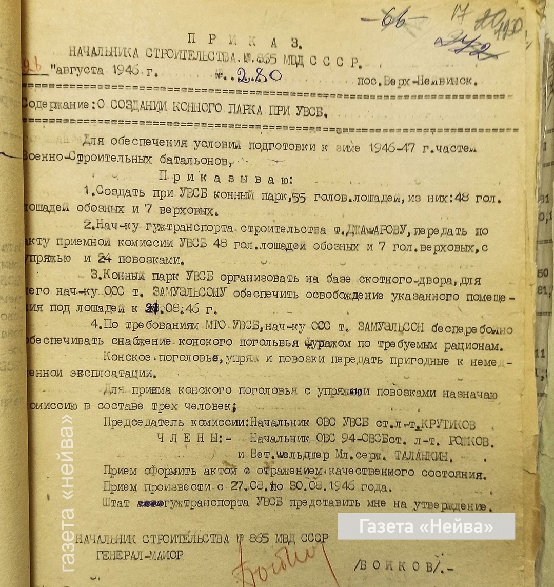 Первым пунктом предписывалось: «Для обеспечения условий подготовки к зиме 1946–1947 гг. частей военно-строительных батальонов приказываю: 1) создать при УВСБ конный парк — 55 голов лошадей, из них 48 голов лошадей обозных и 7 верховых».