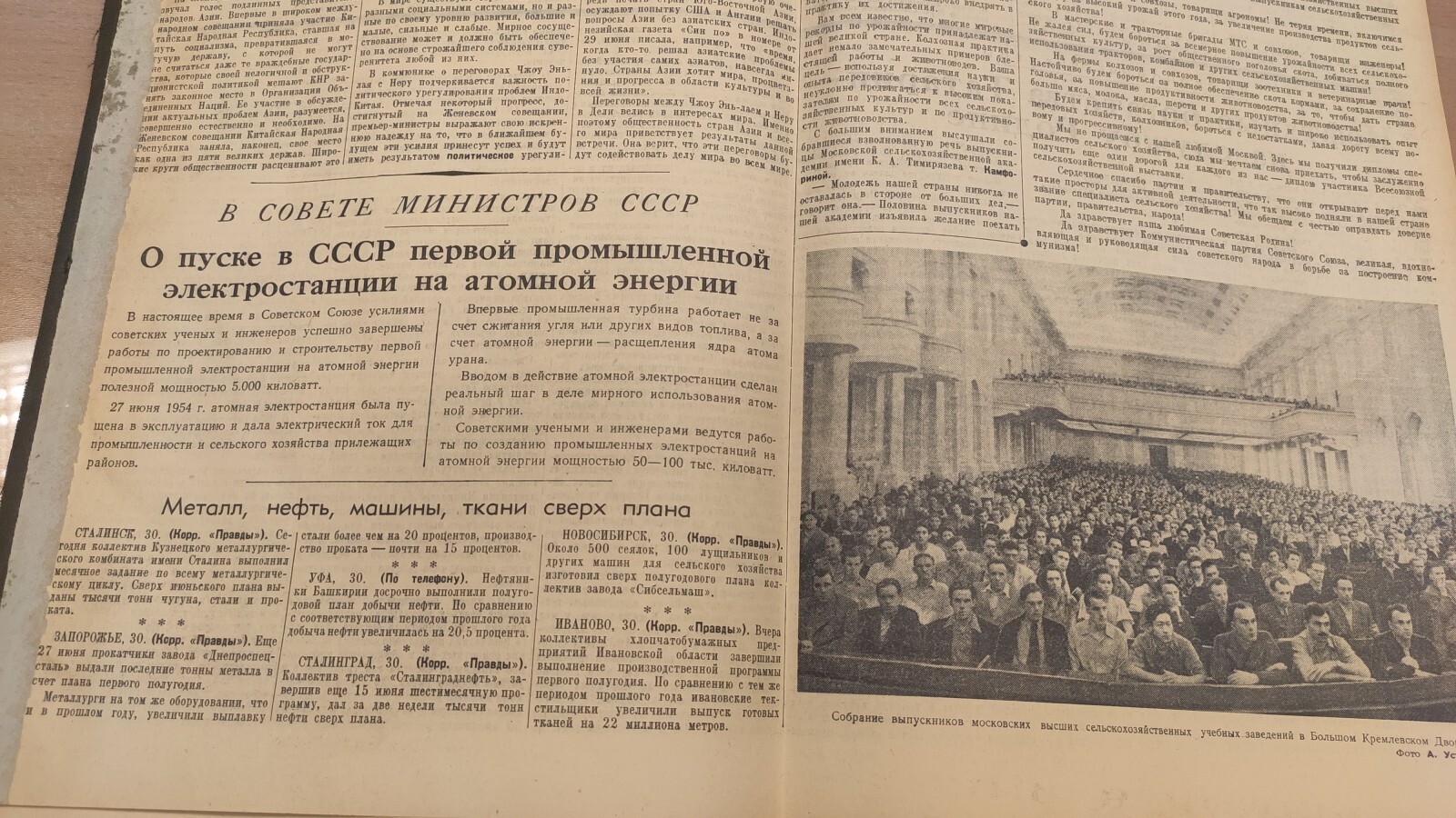 Раритетный экземпляр газеты "Правда" от 1 июля 1954 г. с публикацией о пуске Первой в мире АЭС передан в Обнинск. Торжественная церемония передачи уникального номера газеты прошла в Москве в музее "Атом" на ВДНХ.